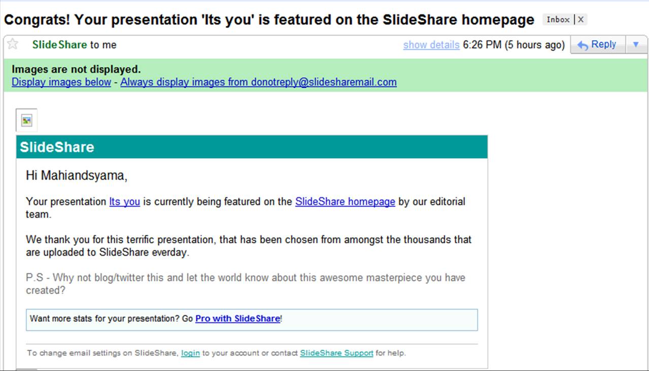 I am very very glad to share with you all that my presentation " Its You" has been selected by Slide Share Editorial team to feature on It's Home Page. Mail from Slide share appended to show off my pride!
